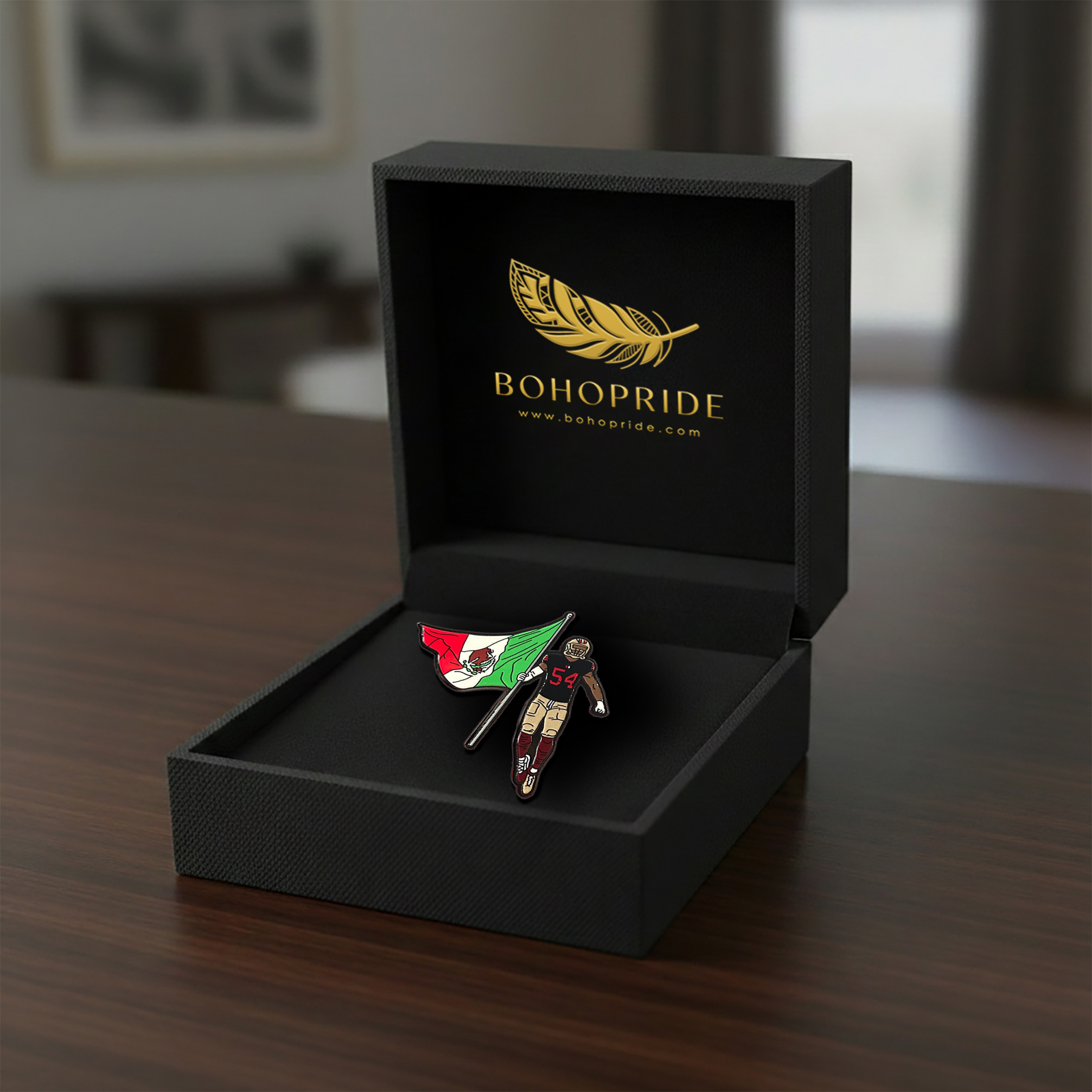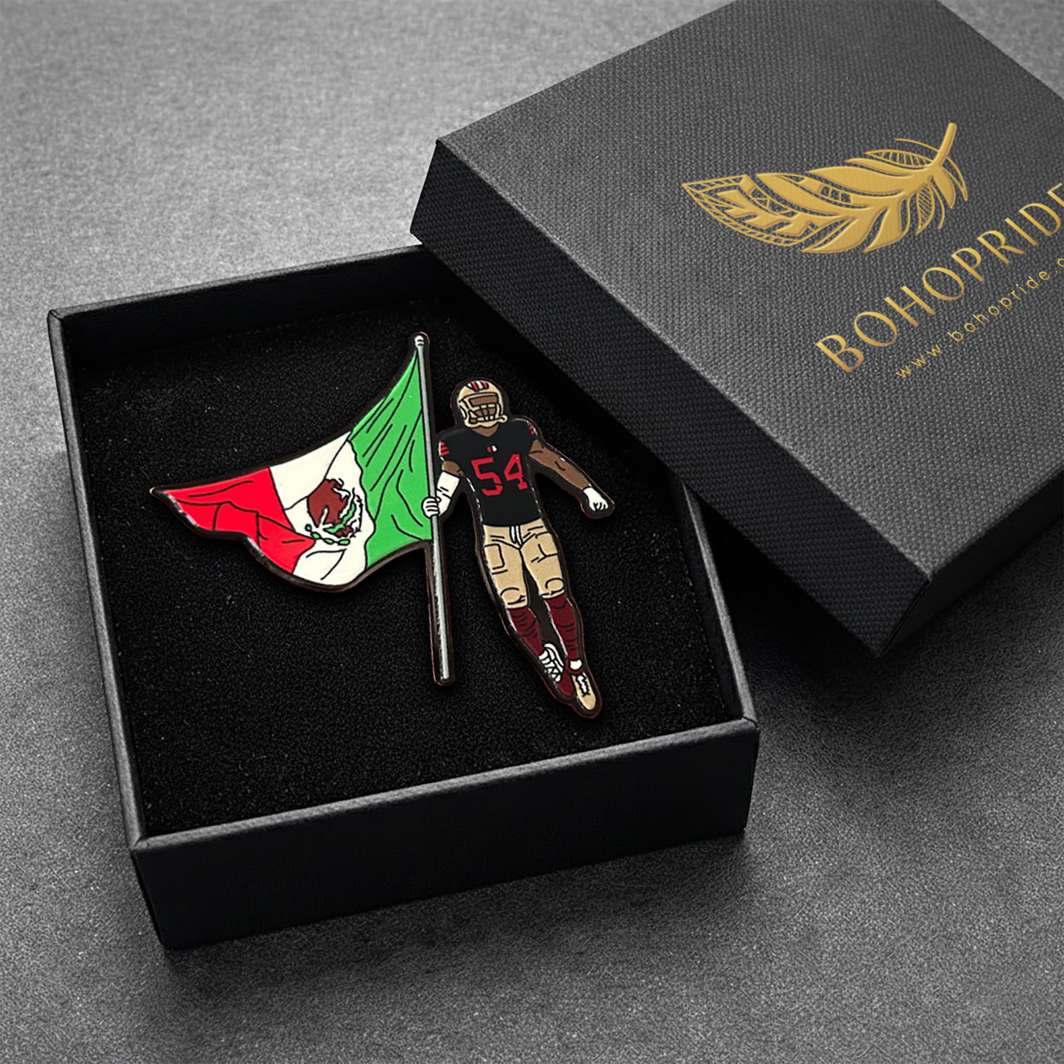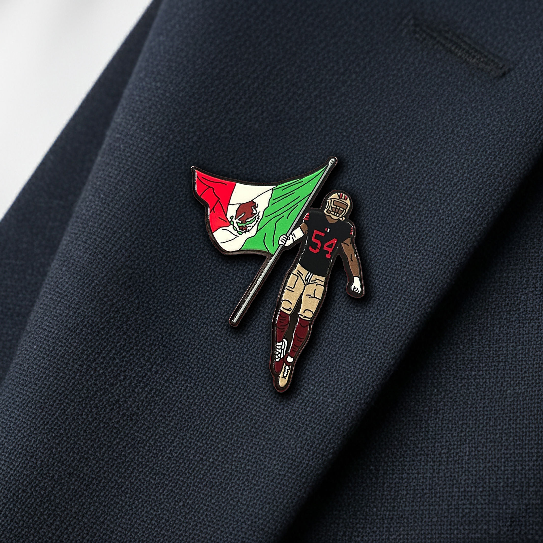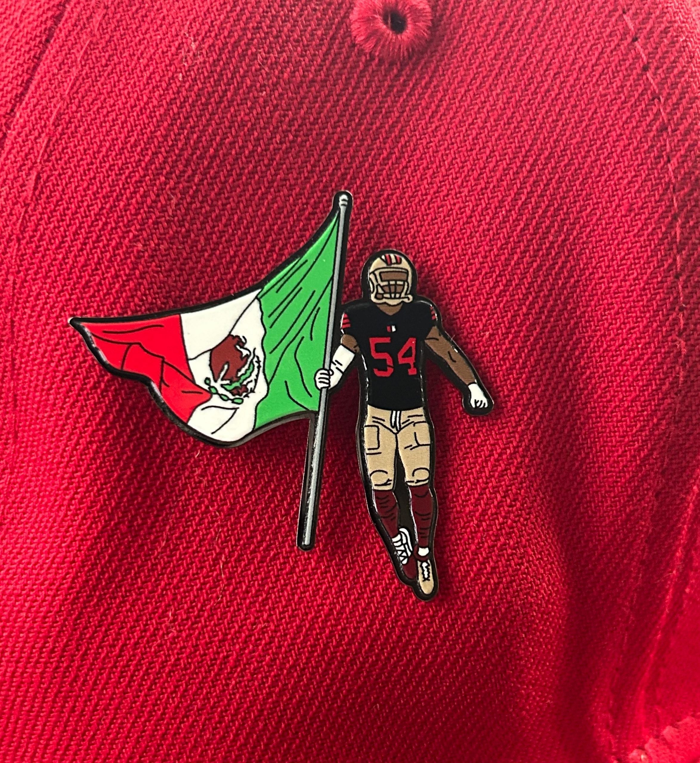 Inspired by Fred Warner and 49ers pride, this pin blends team spirit with the vibrant red, white, and green of the Mexican flag, creating a design that stands out on any outfit or gear.