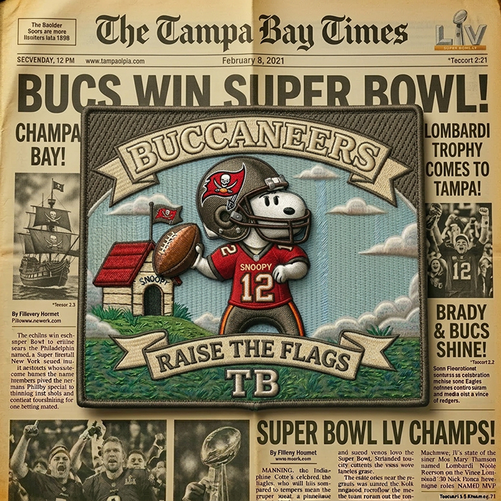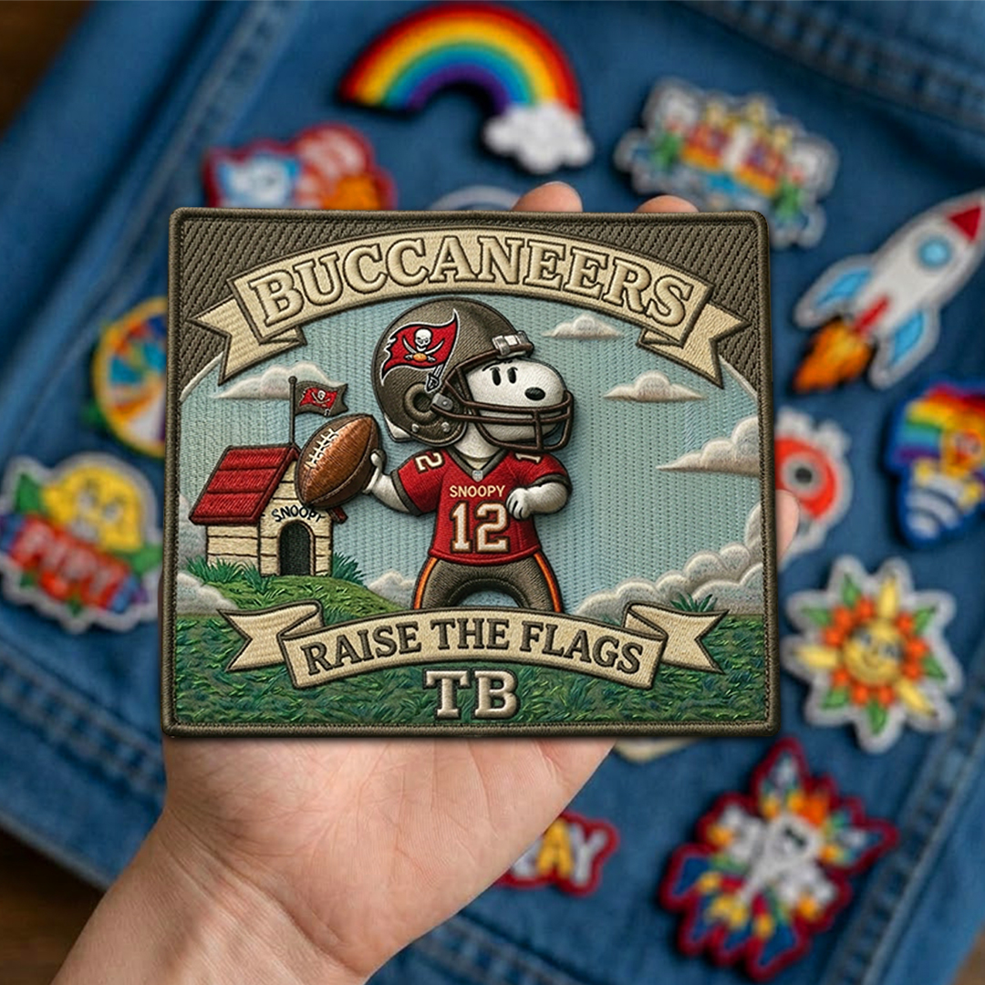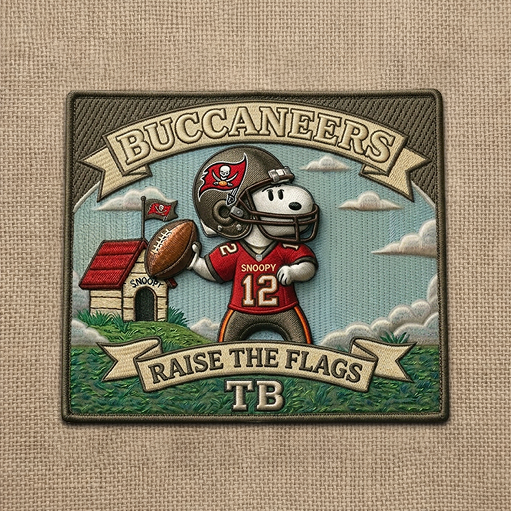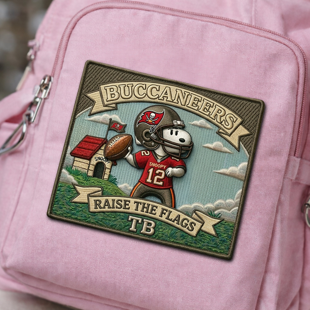 A football-inspired fan patch featuring Snoopy and the Tampa Bay Buccaneers.